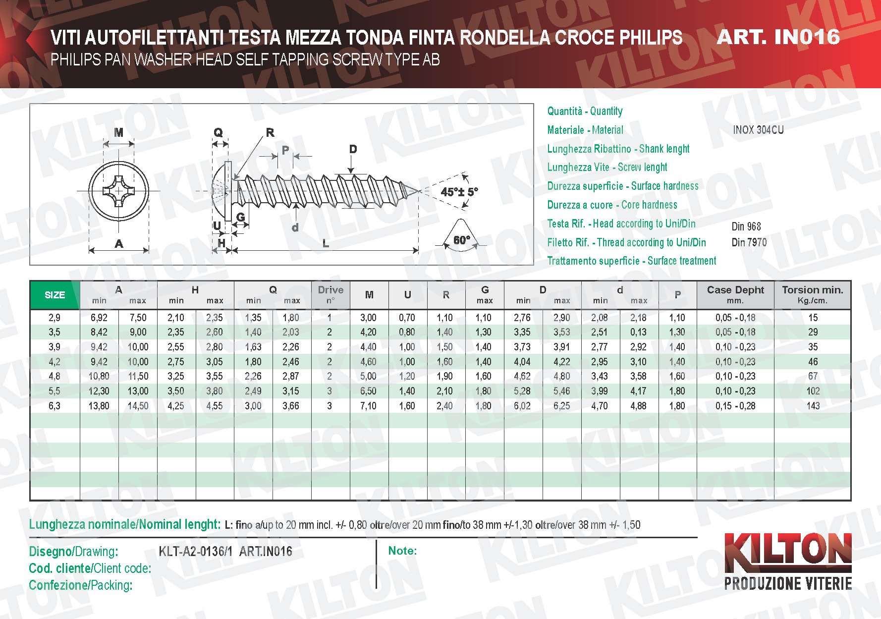 IN016.29095 VITI INOX A2 AUTOFIL. 2.9X 9.5 TFUFR+ DIN 968 C 102000.0